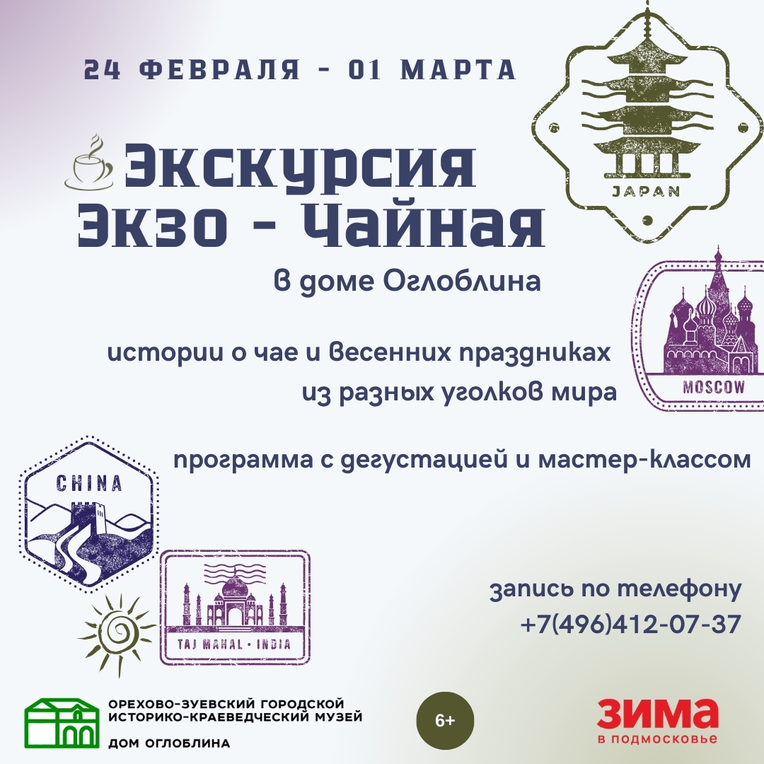 В Доме Оглоблина вы познакомитесь с особенностями чайных церемоний в разных уголках мира, обычаями чаепитий, интересными фактами о чае и о том, какие праздники весны существуют в разных уголках мира, подобно русской Масленице!